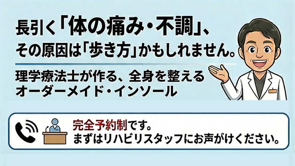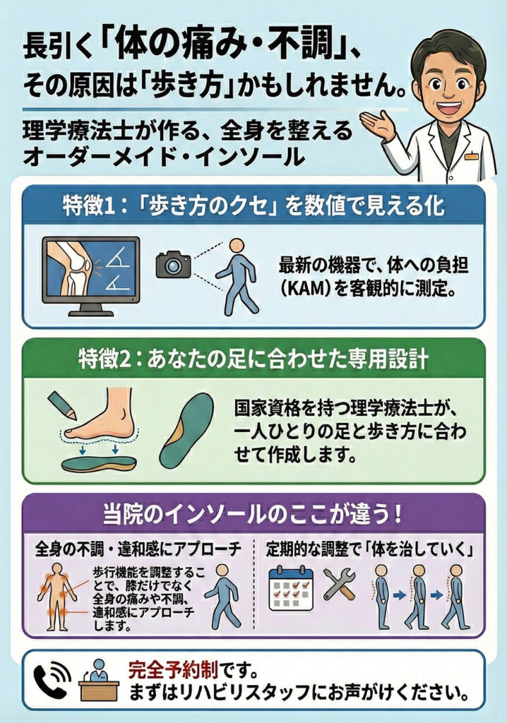 当院のインソールは、ただ履き心地を良くするクッションではありません。履いて歩くことで、正しい体の使い方を自然と学習し、痛みのない体を取り戻すための「医療機器」に近い役割を果たします。